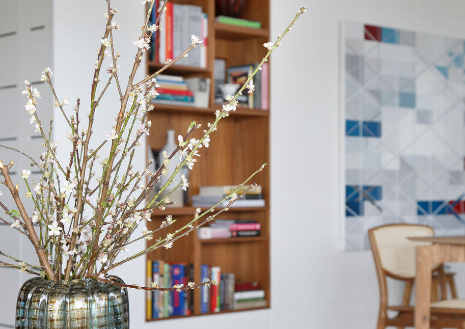A cobertura 051 na Barra da Tijuca, projetada para um recém-casado casal, se destaca pela sofisticação e funcionalidade. Com modificações significativas na sala, suíte master e área externa, o projeto é marcado por uma paleta neutra e o uso de matérias-primas naturais. A sala de estar e jantar, com destaque para o quadro de Manoel Novello, são elegantes e aconchegantes. A suíte master foi ampliada, criando um ambiente espaçoso e sofisticado. A cozinha ergonômica e a área externa funcional completam o projeto, que participou do livro do fotógrafo Denilson Machado.